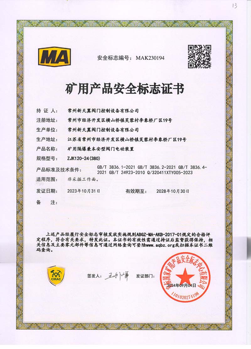 礦用產品安全標志證書ZJK120-24(380)