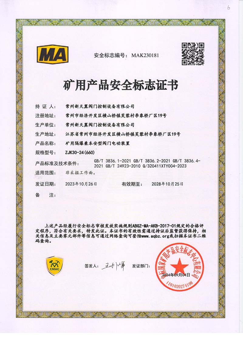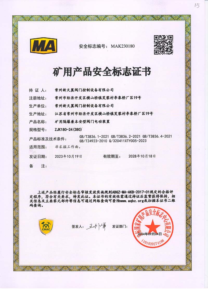 礦用產品安全標志證書ZJK180-24(380)